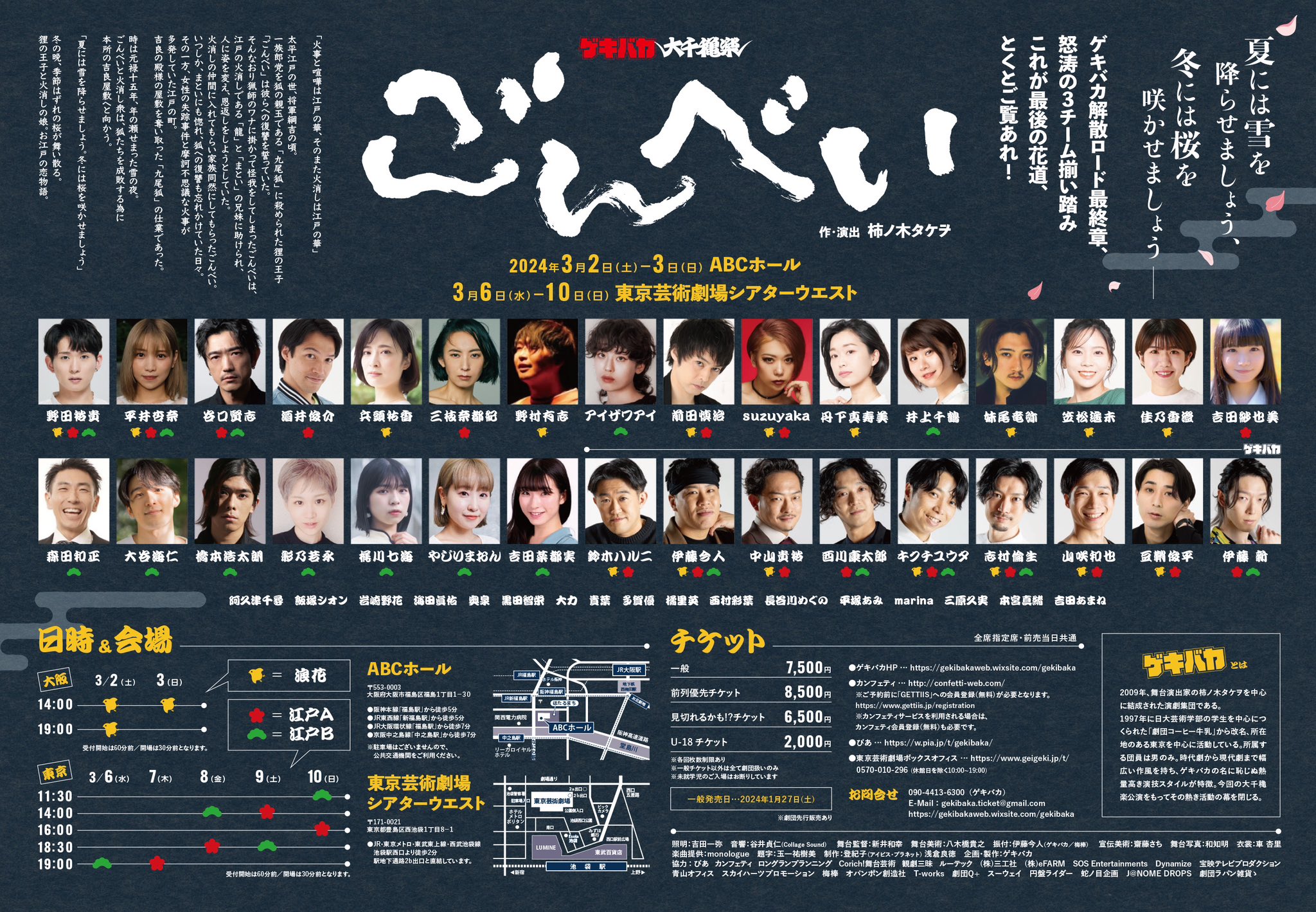 チケット、タイムスケジュールの詳細は ゲキバカ大千穐楽『ごんべい』特設サイトでご確認下さい。
